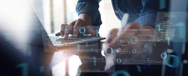 Искусственный интеллект Бизнесмен, использующий технологию ИИ для анализа данных, кодирует компьютерный язык с цифровым мозгом и машинным обучением