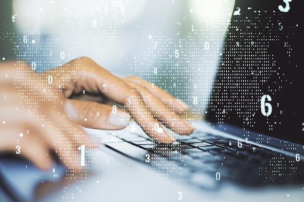 Креативная концепция иллюстрации двоичного кода и набора текста руками на ноутбуке на заднем плане Большие данные и концепция кодирования МультиэкспозицияКреативная концепция иллюстрации двоичного кода и набора текста руками на ноутбуке на заднем плане Большие данные и концепция кодирования Мультиэкспозиция