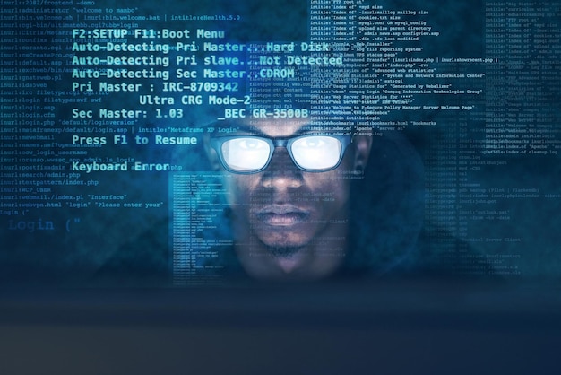 Хакер кибербезопасности и ночь с человеком и кодирование для цифровой трансформации программного обеспечения и фишинга Матрица облачных вычислений и веб-сайт с программистом для технологии паролей и взлома данных