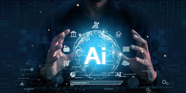 Человек, использующий технологию умного робота искусственного интеллекта искусственного интеллекта, вводя командную строку для создания чего-либо Технология искусственного интеллекта AI Чат с искусственным интеллектом