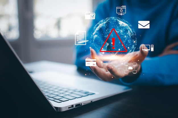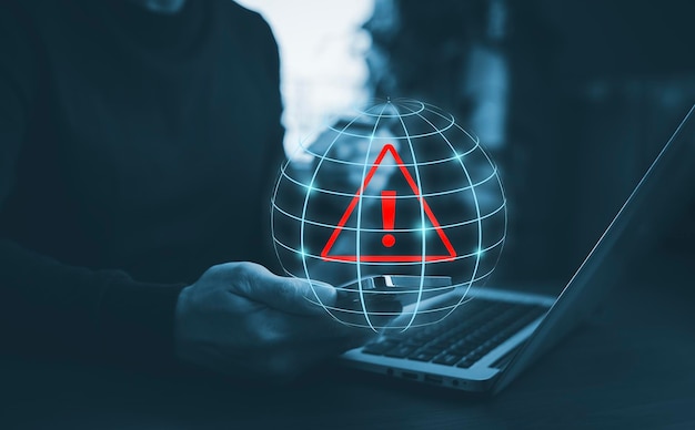 Уведомление об ошибке и техническое обслуживание с треугольником предупреждающий знак для уведомления об ошибке Программист, использующий ноутбук с треуговом предупреждающим знаком хакерские атаки киберпреступность кибербезопасность