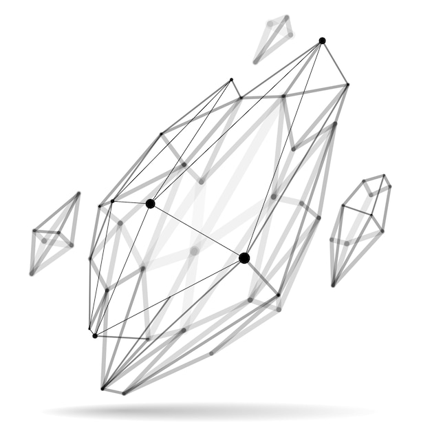 Абстрактная трехмерная векторная иллюстрация формы сетки, точки, соединенные с многоугольным объектом технологии линий, выделенным на белом фоне, динамическая решетка с реалистичным эффектом глубины резкости.Абстрактная трехмерная векторная иллюстрация формы сетки, точки, соединенные с многоугольным объектом технологии линий, выделенным на белом фоне, динамическая решетка с реалистичным эффектом глубины резкости.