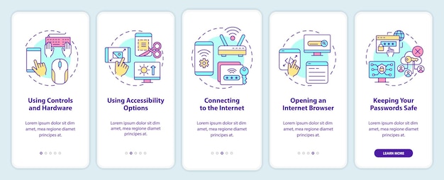 Базовые цифровые навыки на экране мобильного приложения Пошаговое руководство 5 страниц графических инструкций с линейными концепциями UI UX Шаблон графического интерфейса пользователя Myriad ProBold Используются обычные шрифты