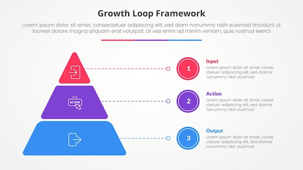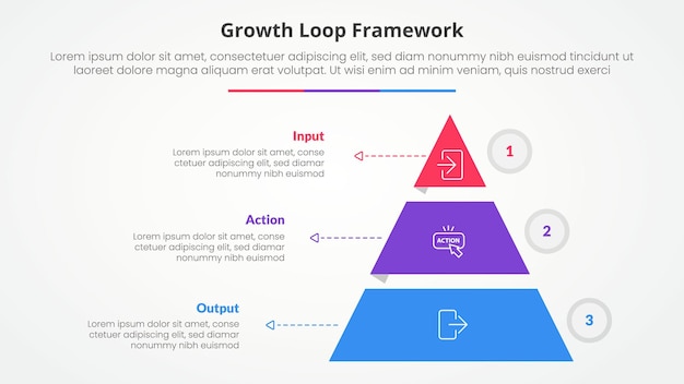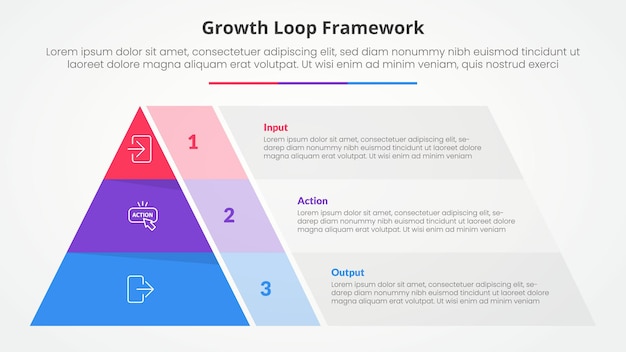 Инфографическая концепция рамки цикла роста для презентации слайдов с пирамидой и прямоугольным ящиком с списком из 3 точек с плоским стилем
