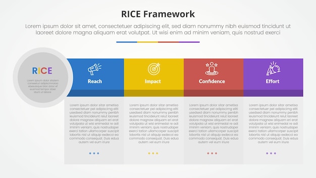RICE scoring model framework инфографическая концепция для презентации слайдов с большой формой таблицы, большим заголовком и краем круга с 4-точечным списком с плоским стилем